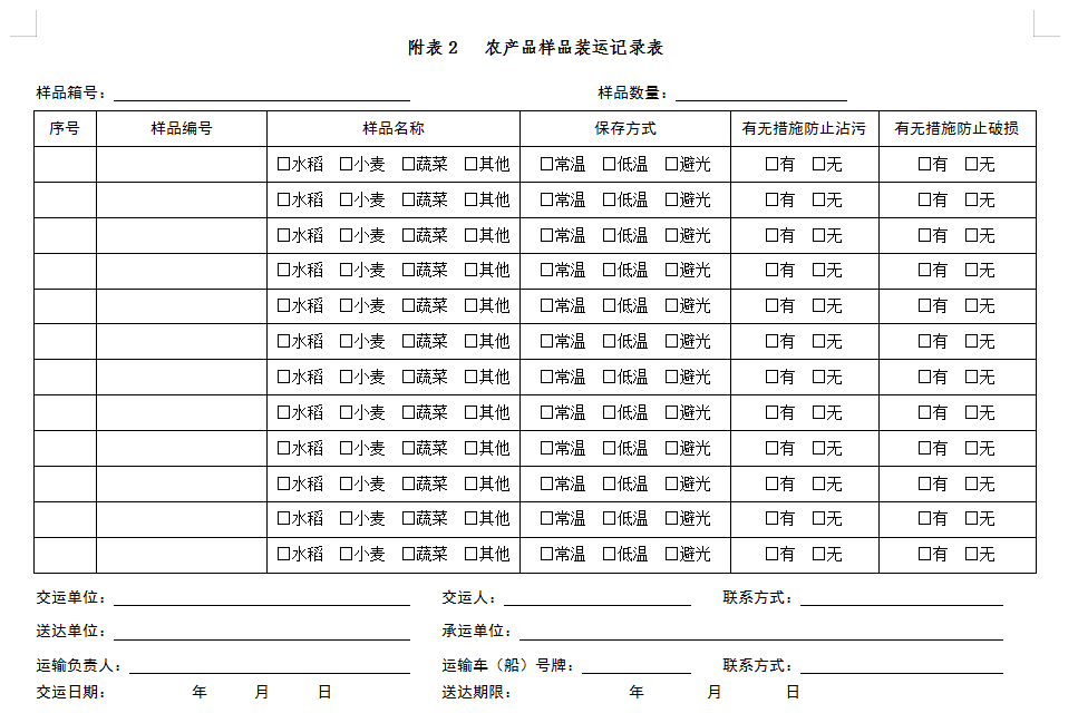 采样小组、初步制备场所和样品流转中心应指定核对负责人,在样品装运现场利用手持终端对样品逐一核对,并在装运记录表上签字;重点检查样品标签、样品重量、样品数量、样品包装袋、保存温度、样品目的地、样品应送达时限等,如有缺项、漏项和错误,应及时补齐、修正后方可装运。农产品样品装运记录表见附表2。