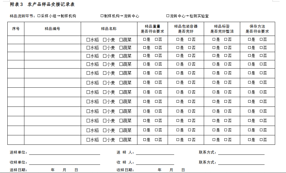 农产品样品送到指定地点后,交样人和收样人均需清点核实样品,利用手持终端扫码确认收样、记录交接信息,打印交接记录表,双方签字并各自留存1份。农产品样品交接记录表见附表3。