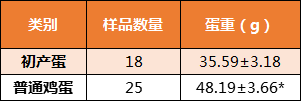 表1 初产蛋与普通鸡蛋重量比较