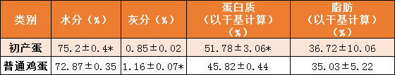 测定常规营养成分。从表2中初产蛋水分和蛋白质含量均高于普通鸡蛋(p<0.05)。若以平均单枚鸡蛋中蛋白质含量计算,普通鸡蛋由于蛋重较高,单枚鸡蛋中蛋白质的绝对含量更高(5.99g>4.57g)。