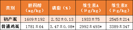 测定初产蛋与普通鸡蛋中磷脂、胆固醇、维生素等成分的含量。从表3看出,胆固醇和维生素E的含量,初产单和普通鸡蛋差异不明显,磷脂和维生素A的含量普通鸡蛋的含量更高(p<0.05)。